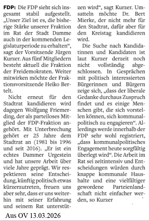 Jürgen Kurzer /Vors. FDP Damme) Kommunalwahl 2026 (Vgl.OV 13.03.2026)