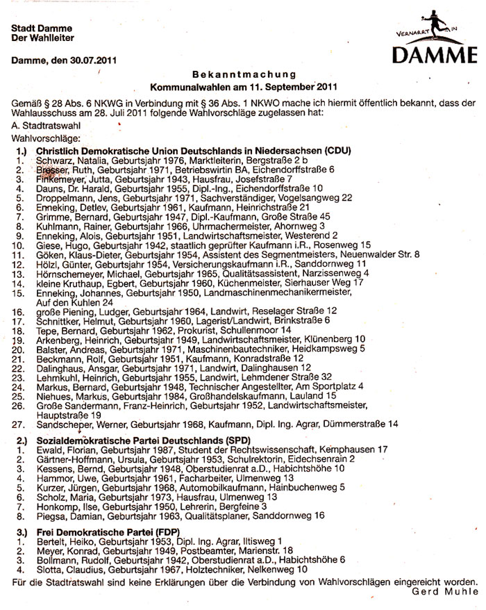 Am 11. September 2011 wird gewählt. Es werden die beiden Parlamente Stadtrat und Kreistag neu gewählt. Viele Kandidaten treten an und natürlich wollen auch wir gewählt werden. Damit die Breite an Meinungen in der politischen Arbeit spürbar bleibt, ist eine gute Opposition dringend nötig. Das garantiert mehr Vielfalt in der Diskussion, mehr Anregungen zu besseren politischen Entscheidungen für Damme.