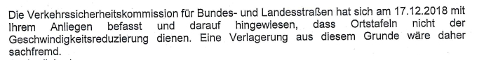 | Der Verwaltungsausschuss hatte in seiner Sitzung am 12.09.2018 den Beschluss gefasst, bei der Unteren Straßenverkehrsbehörde (Landkreis Vechta) zu beantragen, die Ortstafel an der Holdorfer Straße Höhe Waldstraße in Richtung Holdorf auf die Höhe der Lenaustraße zu versetzen. Der Landkreises Vechta hat abgelehnt. |