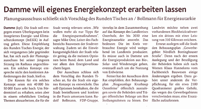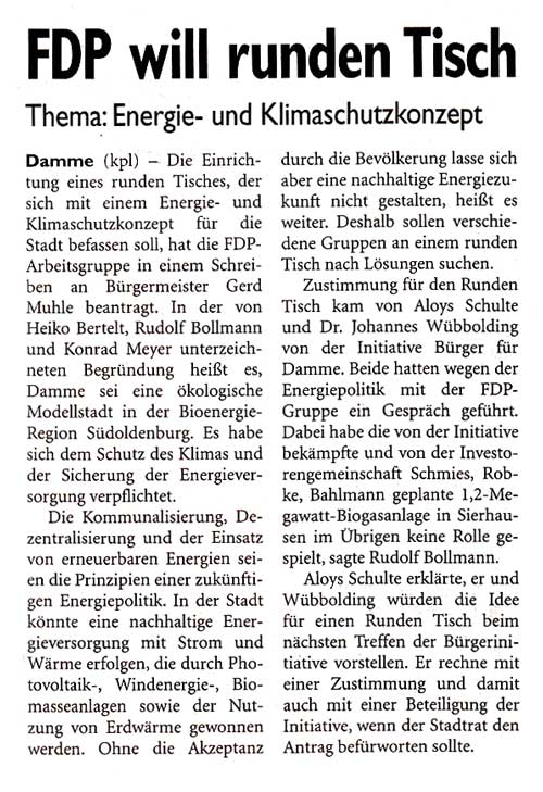 Antrag der FDP-Gruppe auf Einrichtung eines runden Tisches für ein Energie- und Klimaschutzkonzept für Damme vom Ausschuss befürwortet 15.6.2011 |