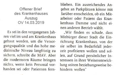 "Grieshop verteidigt Parkplatz" (OV 9.11.2019) "Das Krankenhaus benötige die zusätzlichen Stellplätze... Hier gehe das Gemeinwohl über die Interessen der protestierenden Anwohner...Es liege eine Resolution mit mehr als 1200 Unterschriften vor, die zusätzliche Parkplätze fordern. Das Ingenieurbüro wies zudem die Kritik an dem Lärmgutachten zurück. |
