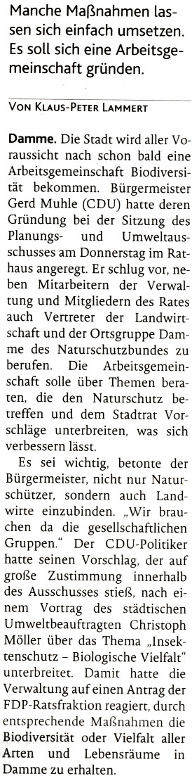 | Mit Schreiben vom 07.05.2019 beantragt die FDP-Stadtratsfraktion, dass durch entsprechende Maßnahmen die Biodiversität auf dem Gebiet der Stadt Damme erhalten bzw. gefördert werden soll.