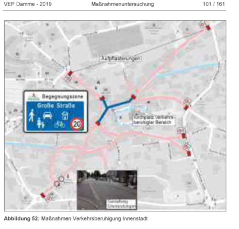 "Zur Erhöhung der Aufenthaltsqualität in der Dammer Innenstadt sollen geschwindigkeitsdämpfende Maßnahmen als Elemente der Verkehrsberuhigung untersucht werden. Bei dieser Variante wird die die Erreichbarkeit der Innenstadt nicht beeinträchtigt." vgl. dagegen bei Einbahnstraßen)