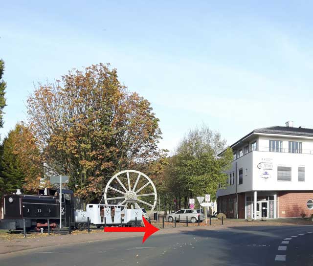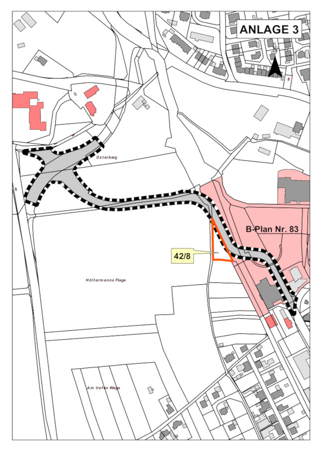 | Die geplante westliche Entlastungsstraße verläuft vom Westring über "Im Hofe" durch die Enge zwischen Dersa Kino und Bowling Center hindurch bis zur Einmündung in die Lindenstraße. Sie soll so breit wie der Ohlkenbergsweg werden. Und: Der Trasse werden Bäume, Gehölz und Hecken zum Opfer fallen |