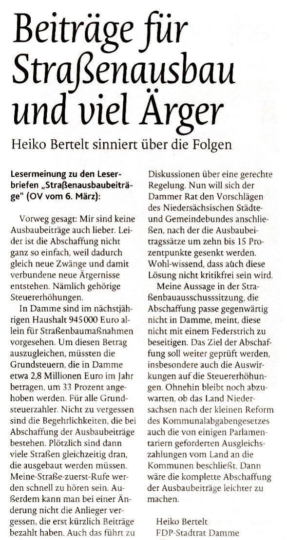 Eine komplette Abschaffung der Straßenausbaubeiträge passt nicht für Damme. Eine Umstellung auf eine grundsteuerbasierte Finanzierung bedeutet Steuererhöhung, die mit der FDP nicht zu machen ist.