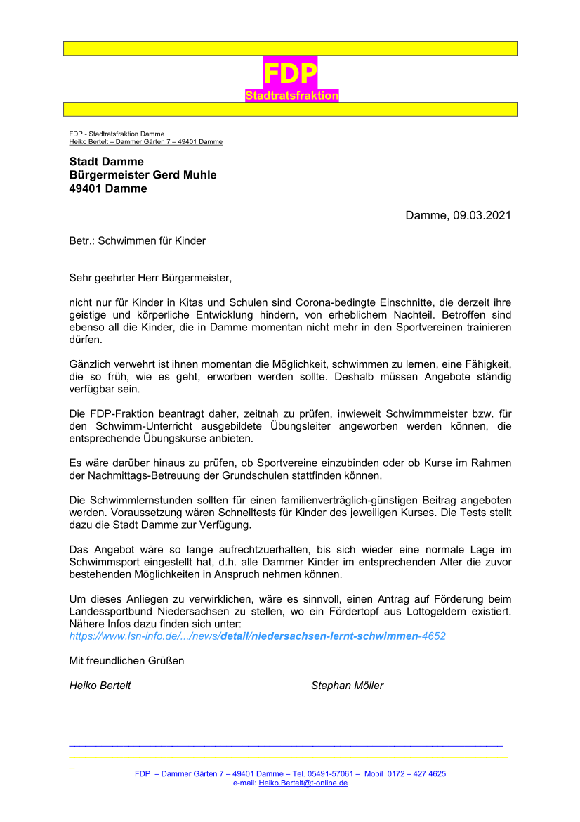 Konkret sollen Gespräche mit dem Landkreis Vechta aufgenommen werden mit dem Ziel, dass das Hallenbad des Gymnasiums auch nach der Öffnung des Dersabades für die Durchführung von Schwimmkursen geöffnet bleibt. Darüber hinaus soll das Schwimmbad der Marienschule für diesen Zweck auch an Samstagen sowie in den Sommer- und Herbstferien zur Verfügung gestellt werden |
