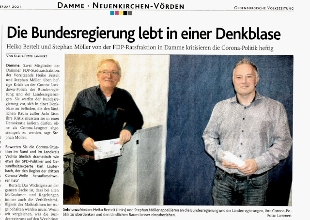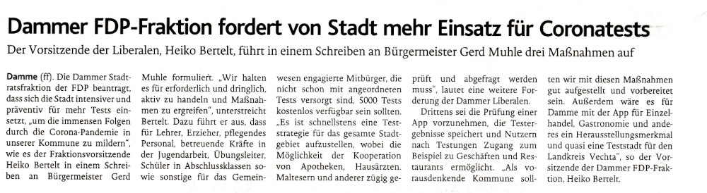 Die FDP Damme schlage vor, für die Öffnung von Geschäften alle Formen der Testungen in Verbindung mit einer Tracking-App etwa beim Besuch eines Restaurants und/oder eines Einzelhandelsgeschäfts einzusetzen. Die FDP werde im Rat den Antrag einbringen, die Stadt solle Schnelltests kaufen und sie den Bürgern zur Verfügung stellen. So könnten Lockerungen in Gastronomie und Einzelhandel durchgeführt werden. Das wäre besser als ein dauerhafter Lockdown mit all seinen psychischen, sozialen und wirtschaflichen Folgen. |