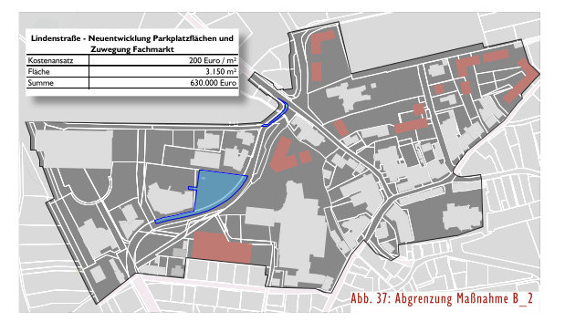 Die bisher bestehenden Zugänge zum Fachmarktzentrum im Bereich des Kinos und sowie über die Straße Im Hofe sind wegen ihrer Randlage nicht optimal verortet, um einen möglichst direkten Lückenschluss zwischen Innenstadt und Fachmarkt zu gewährleisten. Um den Boulevard als von der Innenstadt kommende Fuß- und Radwegeachse effektiv mit dem Fachmarktzentrum verknüpfen zu können, wird eine zentrale Zuwegung von der Lindenstraße geschaffen. In der Fortsetzung der neuen Straßenquerungen entstehen Wegebereiche für Fußgänger, die einen verbesserten Zugang zum Fachmarktzentrum ermöglichen. Im Zusammenhang mit der Aufwertung der Wegebereiche wird auch eine Neuordnung der Parkplatzfläche möglich, die bei geeigneter Aufteilung und Erschließung über nur eine Fahrtrichtung mehr Parkplätze als im Bestand anbieten kann. Gleichzeitig soll hier durch eine ansprechende Grüngestaltung eine attraktive Raumkante zum Straßenraum der Lindenstraße hin ausgebildet werden. Mit der Konzeption des Boulevards sowie dem neuen Anschluss an die westliche Entlastung werden punktuelle Änderungen im Straßenquerschnitt erforderlich, wobei die Lage der Fahrbahn allerdings in weiten Teilen der jetzigen Lage und Abgrenzung entspricht. Im Bereich der Apotheke (Hausnr. 12) soll aufgrund der Vielzahl der Kurzzeitparker ein entsprechend reguliertes Angebot an straßenraumbegleitendem Parken geschaffen werden, um den Verkehrsfluss sicherer zu gestalten.