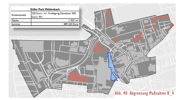 Der schmale räumliche Korridor zwischen Krankenhaus und Innenstadt orientiert sich am Lauf des Mühlenbachs und wird derzeit als versiegelter Weg genutzt. Da im unmittelbaren Umfeld des Krankenhauses keine adäquaten Rückzugs- und Kommunikationsräume vorhanden sind und sich dieser Korridor als verbindende Achse optimal in die neue Freiraumstruktur einfügt, sollen die Flächen als parkähnliche Anlage neu gestaltet werden. Mit der Entsiegelung und der Offenlegung des Gewässers entsteht eine für den Innenstadtbereich hohe ökologische Qualität, die gleichzeitig den Besuchern des Krankenhauses als geschützter Kommunikationsort zu Gute kommt. Mit dem Anschluss an den Boulevard im Norden und den Nebenausgang des Krankenhauses im Süden (siehe Maßnahme B_6) bildet der Stille Park gleichzeitig einen wichtigen Lückenschluss im neuen Wegenetz. Im Verlauf des Grünraums sollen kleine Aufenthaltsbereiche mit Verweilmöglichkei |