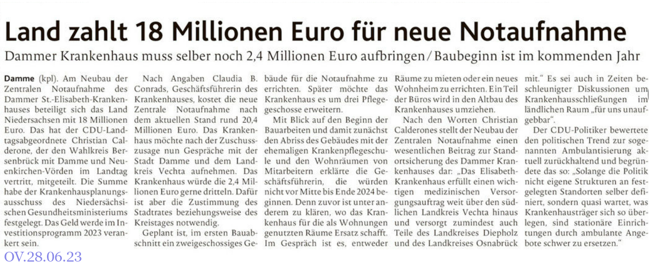 | Nach Mitteilung der OV am 28.06.23 habe das Nieders. Gesundheitsministerium beschlossen, 18 Mio Euro für den Neubau der Zentralen Notaufnahme zu bewilligen.OV-Bericht» | |