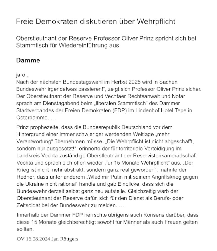 Freie Demokraten diskutieren über Wehrpflicht mit Oberstleutnant der Reserve Professor Oliver Prinz