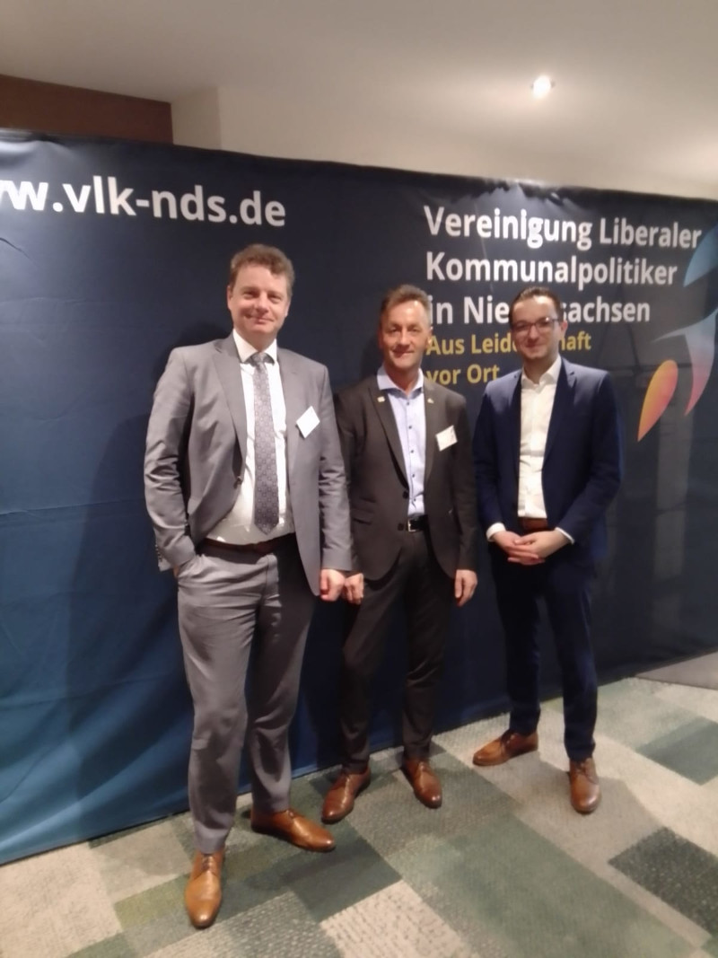 | Jürgen Kurzer (Vors.FDP Stadtverband Damme) auf dem Kommunalkongress der VLK -Nds. am 18.Febr. 2024, eingerahmt von Jens Beeck, Landesvors. VLK (links) und Benjamin Strasser, Parlamentarischer Staatsekretär im Bundesmin. der Justiz. |