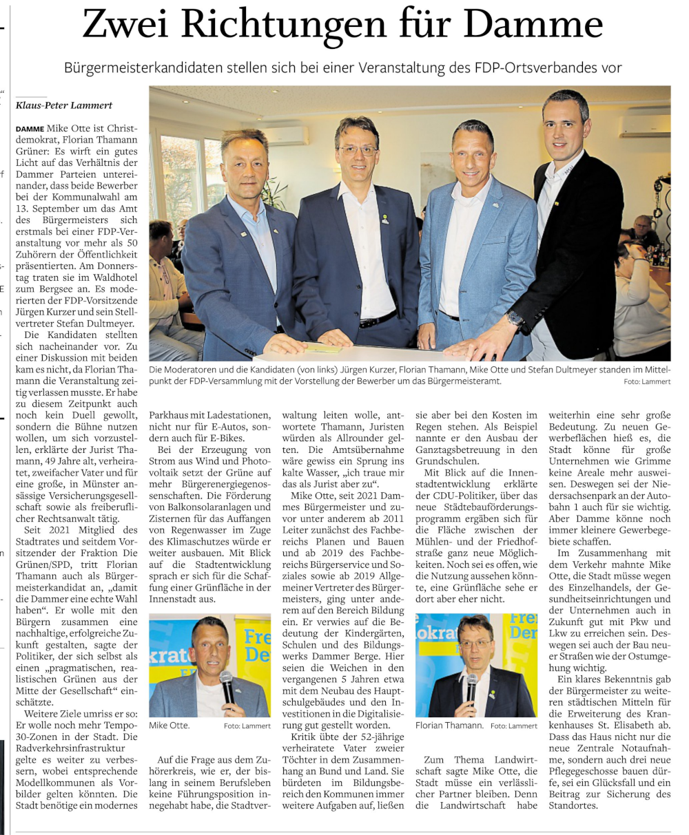 Die FDP Damme hat am 9.4.2026 die Bürgermeisterkandidaten Mike Otte (CDU) und Florian Thamann(Grüne) zu einer gutbesuchten Bürgervorstellung im Waldhotel eingeladen. Die Gesprächsmoderation übernahmen Jürgen Kurzer und Stefan Dultmeyer von der Dammer FDP.
